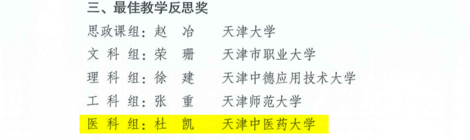 近日,由天津市总工会、中共天津市委教育工委、天津市教育委员会联合主办的天津高校第十七届青年教师教学竞赛中,针灸推拿学院2名青年教师从全市高校的158名参赛选手中脱颖而出,喜获佳绩。其中,中医骨伤教研室杜凯荣获医科组一等奖及最佳教学反思奖,针灸基础教研室吕中茜荣获医科组二等奖。