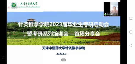为营造浓厚的学习氛围,树立正确的就业观,帮助同学把握考研政策,科学掌握备考方法,合理调适备考情绪,2022年6月3日,针灸推拿学院召开2023届毕业生考研启动会,天津中医药大学副校长郭义教授,针灸推拿学院党委书记孟红,副院长郭永明,党委副书记胡涛,研究员徐枝芳,班主任潘兴芳教授、副教授温景荣、刘延祥、张健,讲师夏青、邱继文、赵美丹,全体辅导员以及2023届毕业生共计300余人参会。