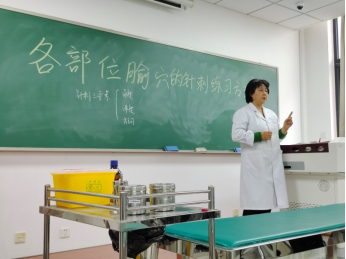 尚秀葵教授先带领同学们简要复习针灸学的基本知识,帮助同学们回想起之前学习过的内容,之后着重强调了“针刺三要素”,即针刺的角度、方向、深度;理论知识讲解后,尚老师为现场同学进行了针刺操作示范。之后,同学们互相组成小组,练习针刺方法,尚老师逐一为每位同学进行纠正。