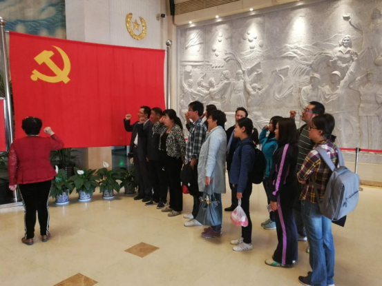 在瞻仰厅,教师党员们驻足仰望《情满江山》汉白玉雕像,领略伟人风采。面对党旗,在党委书记孟红同志的带领下,举行隆重而庄严的宣誓仪式,重温入党誓词。