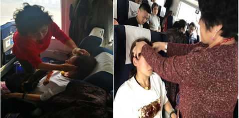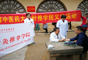 在这里,为培育和践行社会主义核心价值观,我院教师党员组织送医下乡义诊活动,为这里的百姓和游客义诊,并为他们讲解一些常见疾病预防知识和中医药保健知识,为当地百姓普及中医养生保健的治未病思想,运用中医辨证统一的思维针对不同的病情提出了有效的食疗、针灸、拔罐及艾灸等具中医特色的治疗建议。一个小时的时间里,我院教师为游客义诊累计30余人次,得到大家的一致好评。另外,在返津的途中,遇到一位乘客身体不适,我院尚秀葵、孟红两位专家通过针灸和推拿手段为其诊治,身体状况明显好转。通过服务基层社会弘扬奉献精神,积极响应党中央“两学一做”常态化学习教育活动的号召。