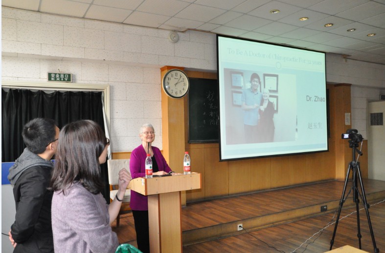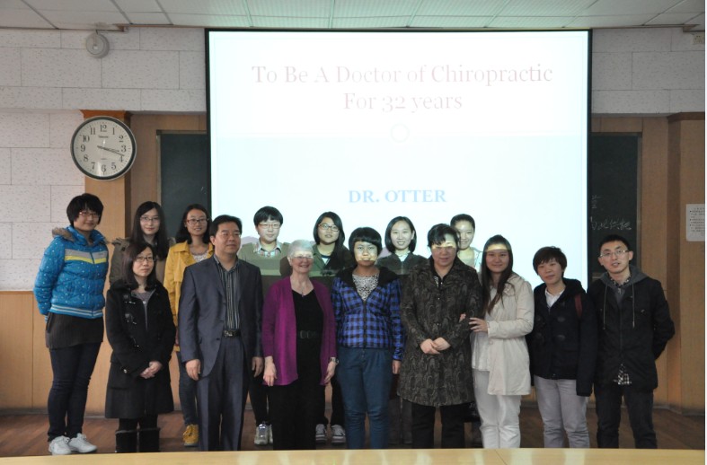简短介绍之后,Dr.Otter以“我的从医经历”为主题展开讲座。首先,Dr.Otter向大家做了自我介绍,作为一名在临床工作了32年的整脊医师,她有着丰富的实践经验,并且在长期的工作中总结出了一套独特的整脊方法。随后,Dr.Otter又详细的介绍了整脊治疗的历史及一些临床案例,并与大家分享了自己多年的临床整脊方法与经验。活动接近尾声,Dr.Otter还与同学们进行了互动,详细的为同学们解答疑惑。最后,Dr.Otter与在场的老师们合影留念。
