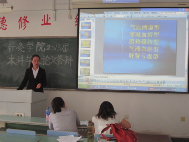 从去年12月,针灸学院每位老师(包括李桂兰老师、王卫老师、于春泉老师、阚湘苓老师)负责7至8名学生的本科毕业论文指导工作。从综述、选题、论文与实际的结合等多方面进行耐心的修改、探讨,指导历时半年。毕业生论文答辩旨在训练学生分析、综合、研究能力。经过半年的论文修改、完善,同学们从中学到了很多东西,不仅深化了基础专业知识,而且对论文写作有了一个更深层次的认识。