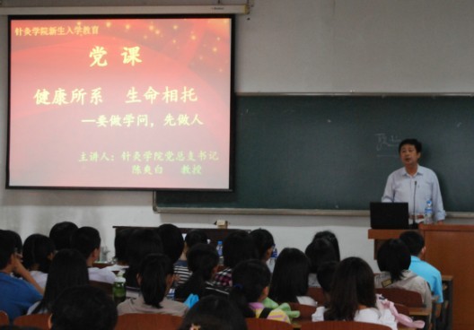 9月7日下午2:00,针灸学院党总支书记陈爽白教授为全体2012级新生上了大学的第一堂“党课”。