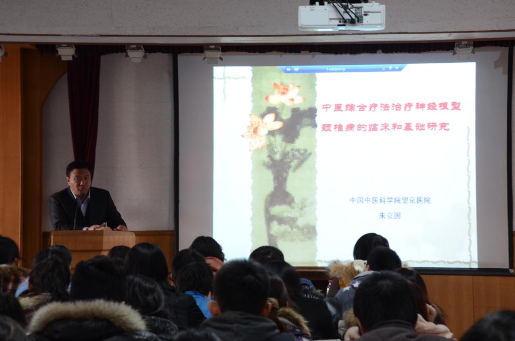 12月23日,中国中医科学院望京医院院长朱立国教授莅临我校做学术讲座。天津中医药大学副校长周桂桐、天津中医药大学第一附属医院推拿科主任王金贵(兼我院副院长)、我院党总支书记孟红、院长郭义、副书记孟向文、副院长郭永明以及我院全体教师参加了此次讲座,讲座吸引了一附院推拿科医生及我校众多硕博士、本科生踊跃参加。