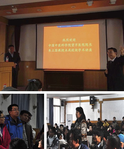随后,朱立国教授开始了题为“中医综合疗法治疗神经根型颈椎病的临床和基础研究”的讲座。朱教授为大家介绍了颈椎病治疗的现状和传统医疗手法并指出其存在的弊端,由此引出了他对颈椎病的多年研究和新式治疗手法——旋提手法。接着,他展示了神经根型颈椎病疗效评定指标体系,并介绍了几种治疗仪器,如治疗机器人等,使中医治疗更加科学化。最后,朱教授与现场老师、同学们进行了互动,就大家提出的问题做了详细的解答。