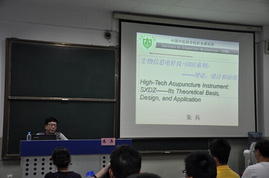 上午8点30分,原中国中医研究院针灸研究所所长,973首席科学家朱兵教授为培训班学员作针刺手法治疗仪的制作及优势和耳针疗法与耳·迷走神经的联系的报告。朱兵教授首先结合神经的作用规律介绍了失忆现象和wind-up&wind-down现象,之后又简述了针刺手法治疗仪的制作的基本原理。随后又重点讲述了耳针疗法与耳·迷走神经的联系,利用实验数据证明耳针疗法对疾病的治疗作用,并提出在耳针治疗癫痫、抑郁症、糖尿病等疾病上面有显著的疗效,为在座的学员以后的临床工作提供了新的思路。