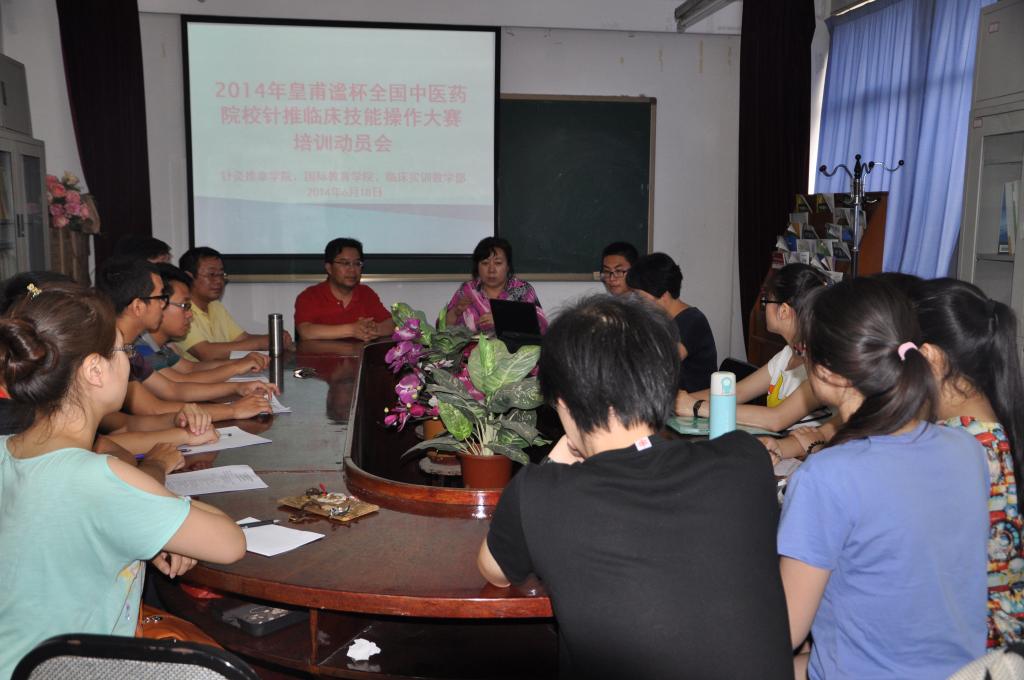 6月18日下午4:00,我院在行政楼711会议室召开了2014皇甫谧杯全国中医药院校针推临床技能操作大赛培训动员会。莅临本次会议的领导和老师有孟向文副书记、郭永明副院长、翟伟教授、李忠正博士、国际教育学院玄明实老师和临床实训教学部席强博士。经过层层选拔,针推学院和国际教育学院的18名参赛学生代表参加了此次活动。