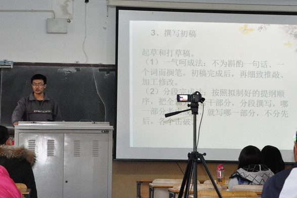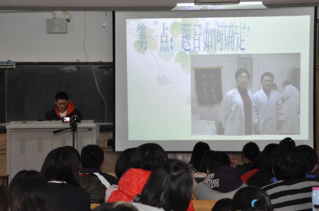 首先,孟书记对“挑战杯&论文”的意义,学院的重视程度以及历届学生取得的一些成就做了简单的介绍,并鼓励同学们“保底线,上水平”,从大一就开始练习写论文。接下来,3名学生代表与同学们进行了论文写作构思与方法探讨以及“挑战杯”参赛经历。2011级针推班的祁赛同学主要从构思、立论、选材、布段谋篇、格式等方面进行了讲述,并分享了自己的作品;2011级骨伤七年制班樊一桦同学主要展示了自己如何从针刺手法中找到灵感,并用于拔罐上的经历,还让大家观看了自己的一些实践视频,鼓励同学们多从生活中发现课题,寻找灵感;2010级康复班的王丹丹同学则对自己几年来在参加“挑战杯”大赛过程中遇到的问题做了剖析,强调了队友的能力及团队分工的重要性,鼓励同学们去完成自己的梦想。