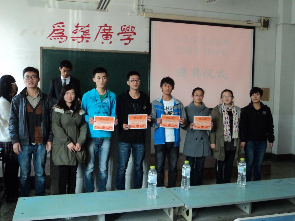 11月15日中午12:30,学院学生会体育部于南教104举办了“迎新杯”篮球赛、排球赛颁奖仪式。出席此次活动的有赵美丹老师,主席团成员赵悦、王鹏、崔志文、高少伟等。